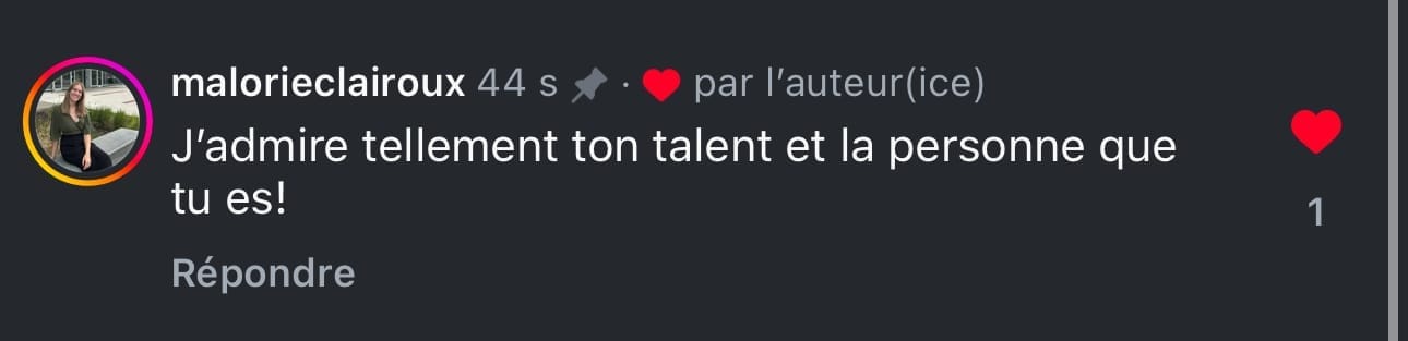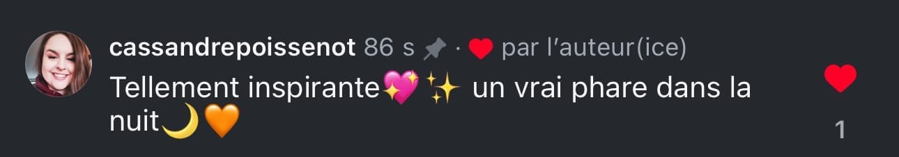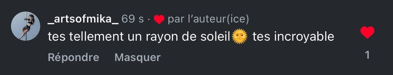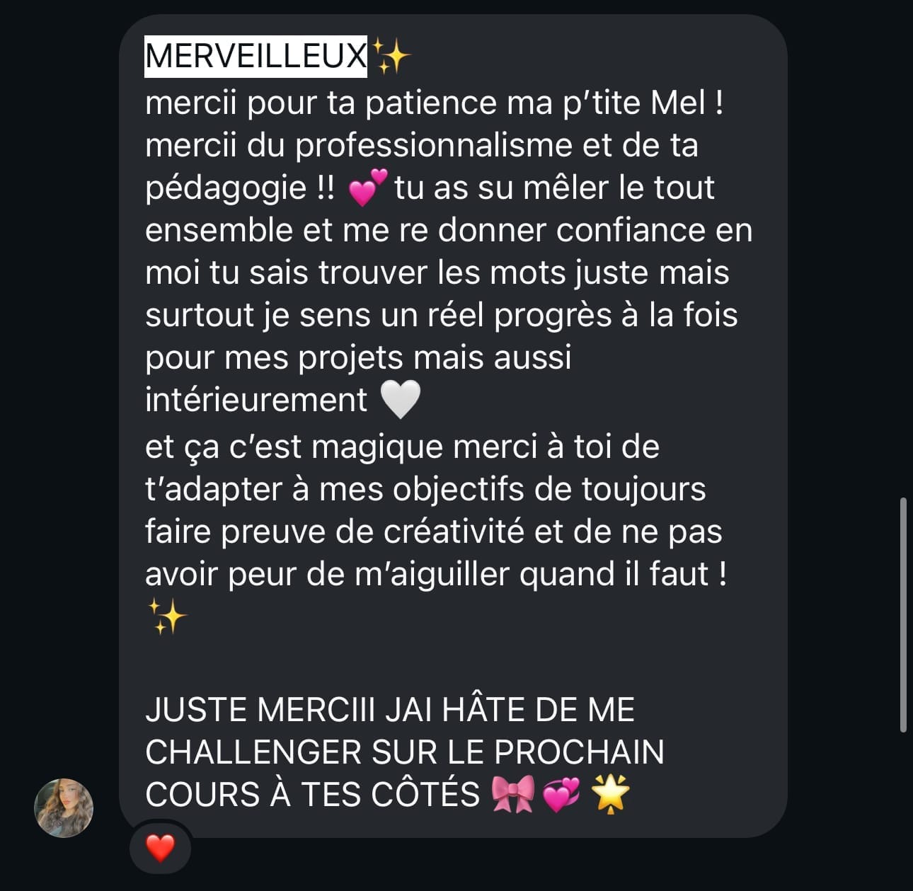 « I love being in your program! Dès la toute première séance, j'ai senti que ton approche résonnait vraiment avec moi. Ça m'a donné envie de l'intégrer à ma routine hebdo. Ton feedback est super pertinent et me pousse déjà à évoluer. I LOVE the meditation. C'est vraiment spécial et unique. Totally my vibe, can't wait to keep going! »