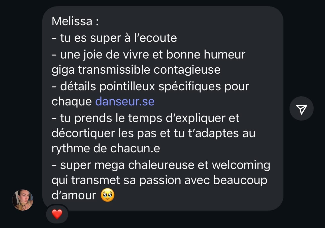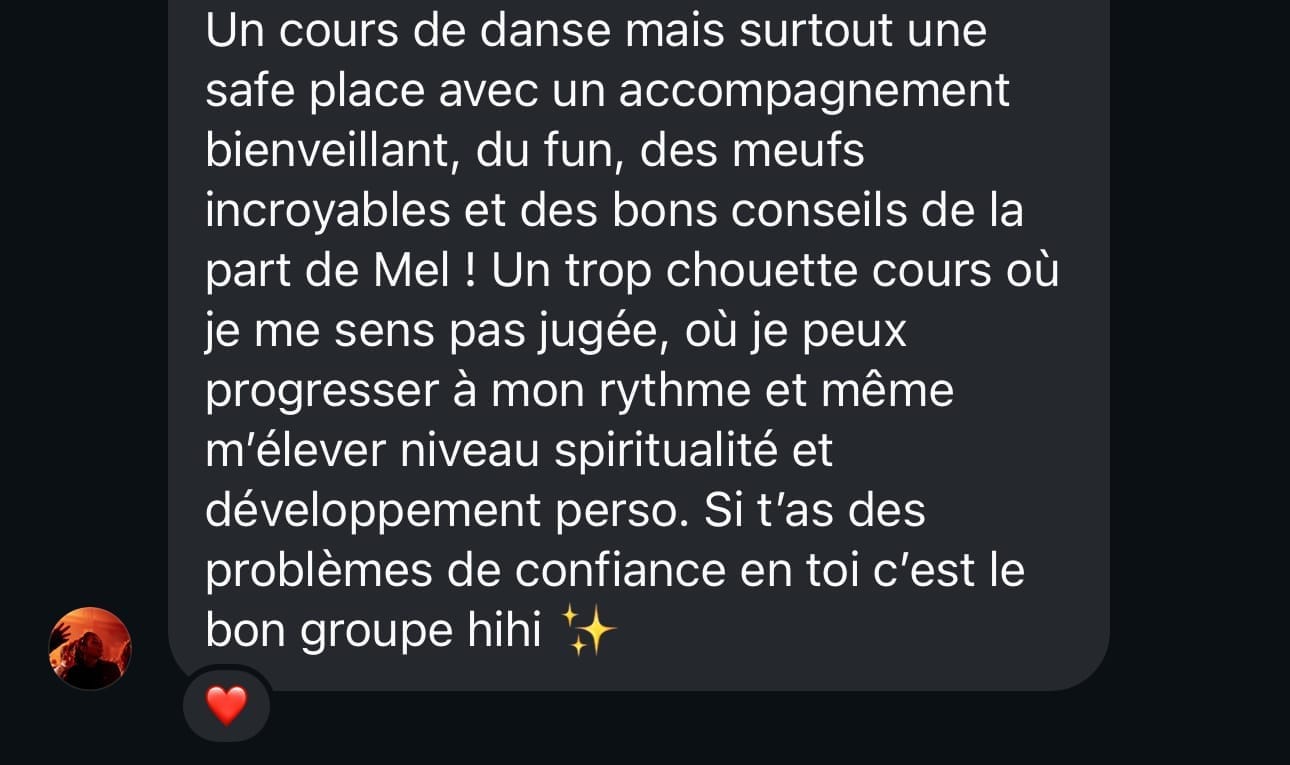 « Tes ateliers sont vrmt powerful! Le sentiment que l'énergie flow, qu'on connecte, qu'on s'encourage dans toutes nos différences. Le sentiment que tout le monde a sa place! Mercii! I just cried durant la méditation. J'ai vrmt senti que je pouvais juste être et partager toute mon énergie :) » - Kenza